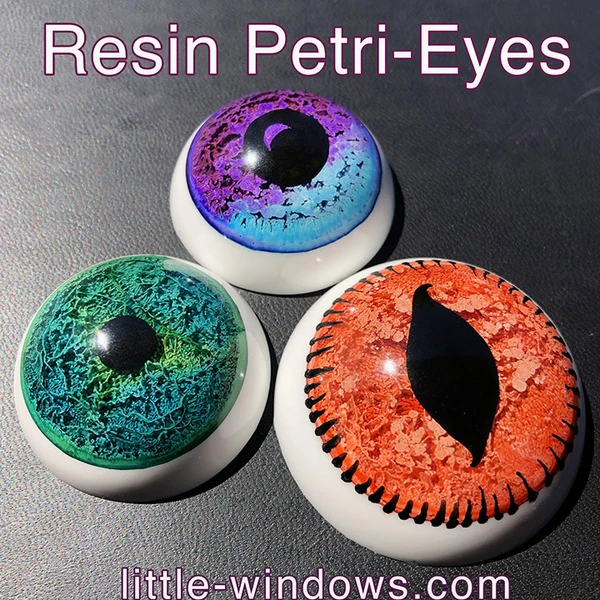 To make Petri Eyes follow the instructions for Glitter eyes, but using the petri-resin technique for the iris layer instead.