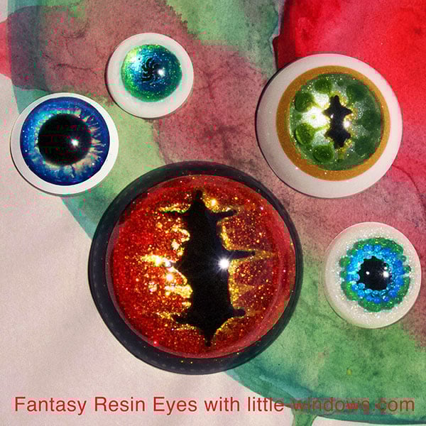 I am sooooo hooked on making resin eyes. I've found 4 ways to do it, each has its uses. All of them were made with our Brilliant Resin and Silicone Cabochons Mold, and all require layers of resin, so leave yourself at least 4-6 hours between each layer for set-up.