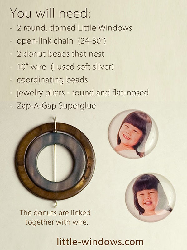 The tricky part is finding donuts that fit within one another. Don't feel like you have to stick with shell beads, you can try those cool resin donuts, metal ones, anything you can find, really. And the inside one doesn't even have to be a donut, it can be a flat bead too. You can get these beads online, and they may have them at your local craft store or bead shop, just be sure the holes are drilled straight. I've made my domed pieces a bit smaller than the inner bead so the pink of the shell will show, but it can cover the whole bead too. There are lots of ways to customize this design, from the type of chain to the accent beads and the charm you use at the bottom.