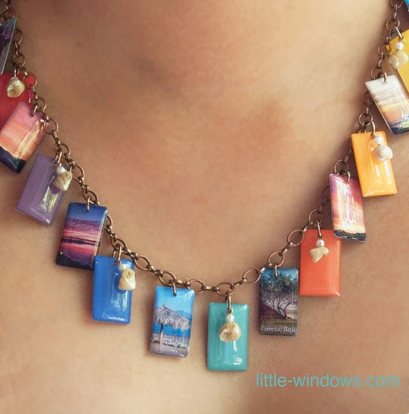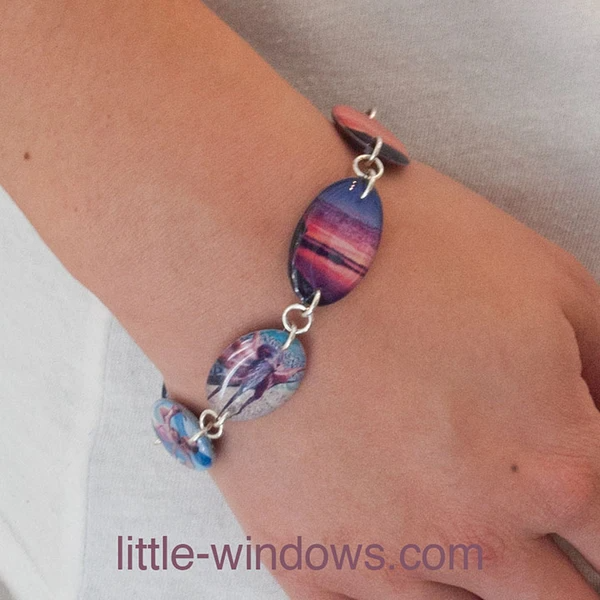 The amazing bracelet below was created by Connie in Satsuma, FL. She used the Small Oval from our Little Windows Photo Cropping Software to shrink and crop her picture, then used the Doming Technique to create these gorgeous charms. These beachy photos, linked in with some lovely drilled shells makes the perfect Summer Keepsake.