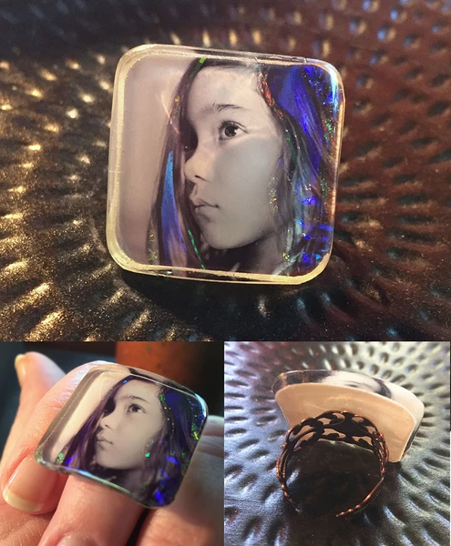 This one is embellished with our Dichro-ISH Film, and glued onto a ring base using a bit of resin leftover from our next batch: