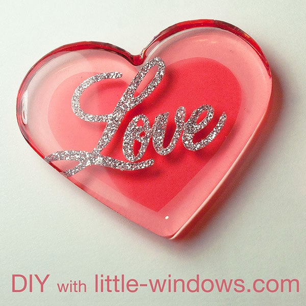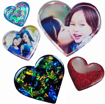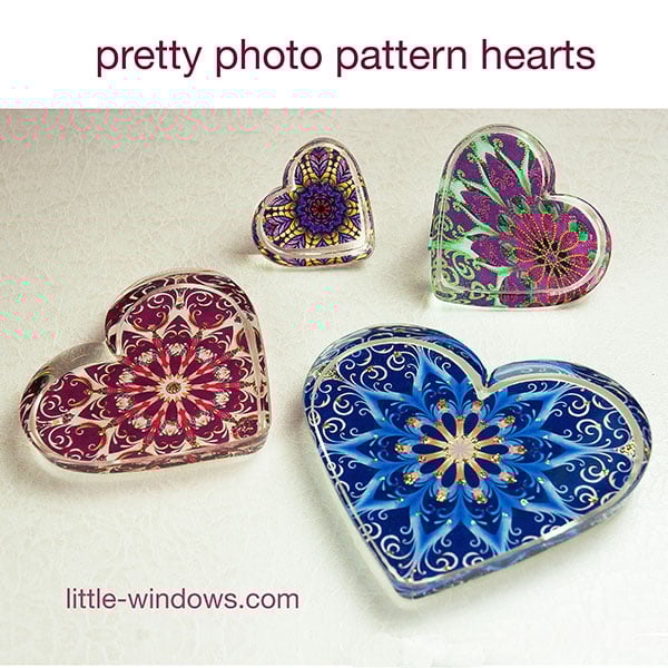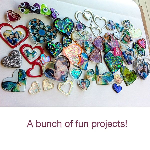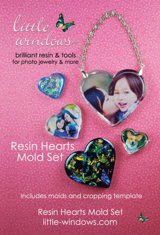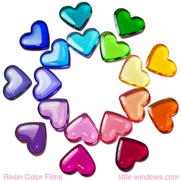 Resin Color Films can be used in casting, doming, and layering projects. These domed hearts show our 18 colors of Resin Color Film - Jewel Colors in the outer ring, Pale Tints in the inner ring - punched with our Heart Punches: