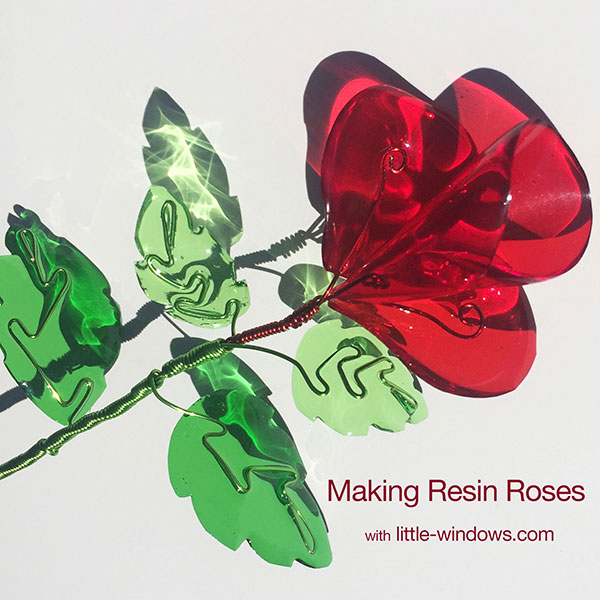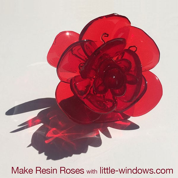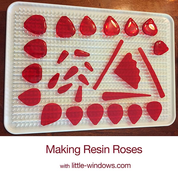 You can make beautiful, everlasting roses with Little Windows Resin Color Film, a Silicone Doming Tray and some wire. First, cut petals out and dome them with Brilliant Resin. The shapes on the top have resin applied. Ignore the long skinny pieces, those were for another experiment :)