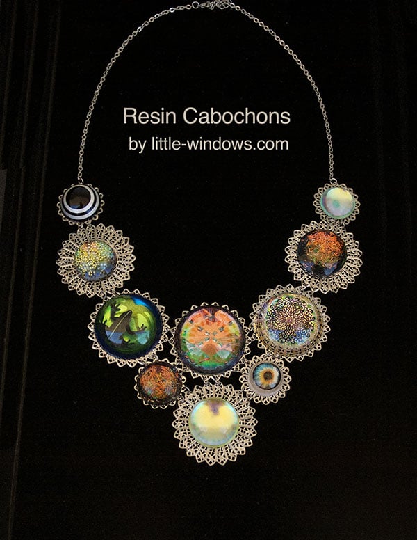 In this piece I embedded the plastic frog in a layer of clear resin, let that set up, then painted the lily pad with metallic acrylic paint. I let that set up, then poured another clear layer, let that set, and painted the back with blue metallic acrylic paint. This cabochon was mounted as part of a necklace.