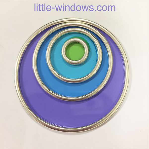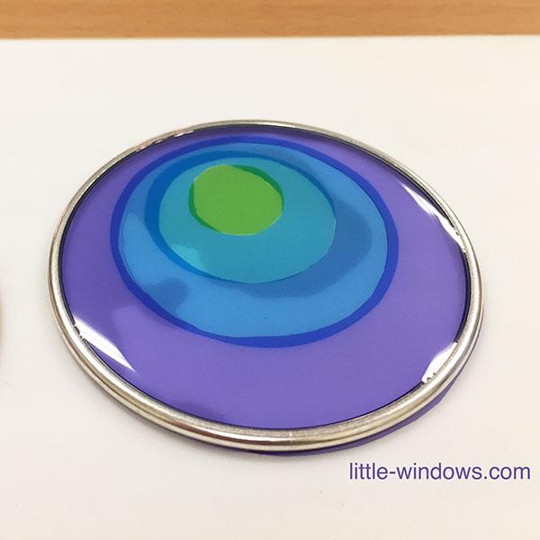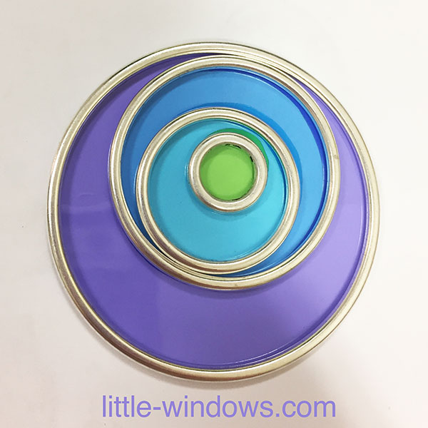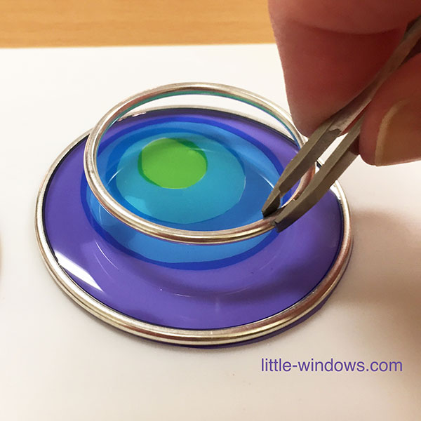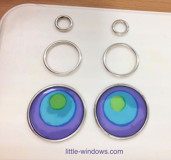 Step 1: Select the sheet colors you want to use, then cut circles of Resin Color Film to fit behind each of the Hoops - they don't have to be perfectly cut as the hoops will hide the edges. Cut the middle out of each circle where the next smallest hoop will be, so that colors don't overlap.
