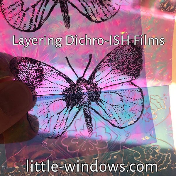 For the sparkle shown in my finished projects - and to give your film support while doming - you'll want to double-up your Dichro-ISH Films. You can use 2 layers of the same color film, or you can select another color to add to the effect. I'm using scraps from my Embossed Dichro-ISH Color-Shift Jewelry video, CLICK HERE to watch that tutorial.