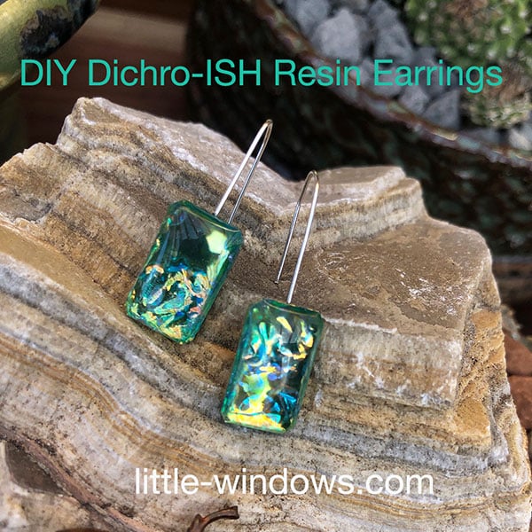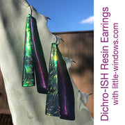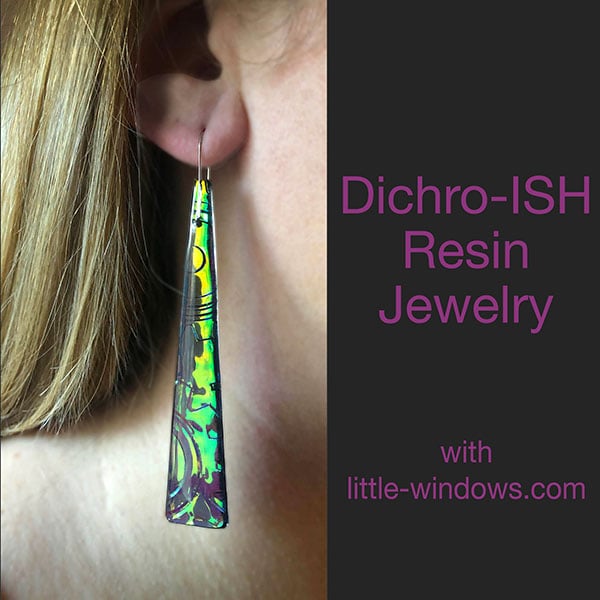This pair of earrings looks totally different depending on the lighting. I used Dichro-ISH Film embossed with the gear pattern folder, then domed on both sides with jewelry findings embedded in the resin. They are long but lightweight!