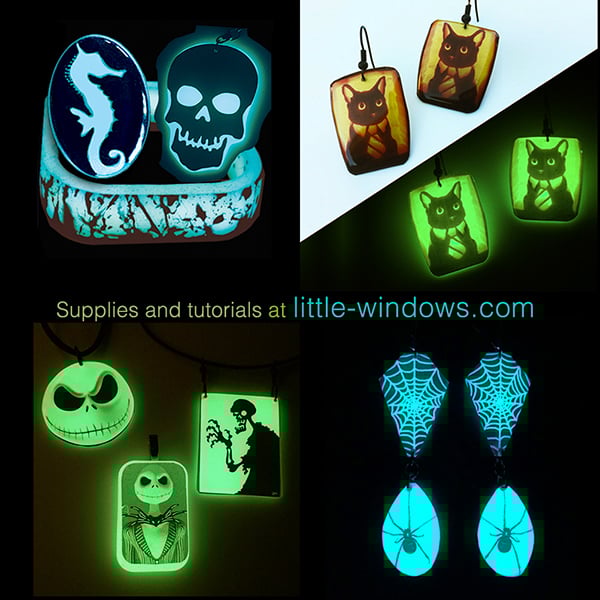 Many ways to make glow in the dark resin jewelry wth Brilliant Resin + glow in the dark additives, using images on Clear Photo Film or stickers to make glow in the dark resin jewelry and resin art. Casting and doming how-to's. Fun for Halloween and year-round! Get the best resin jewelry supplies here at little-windows.com