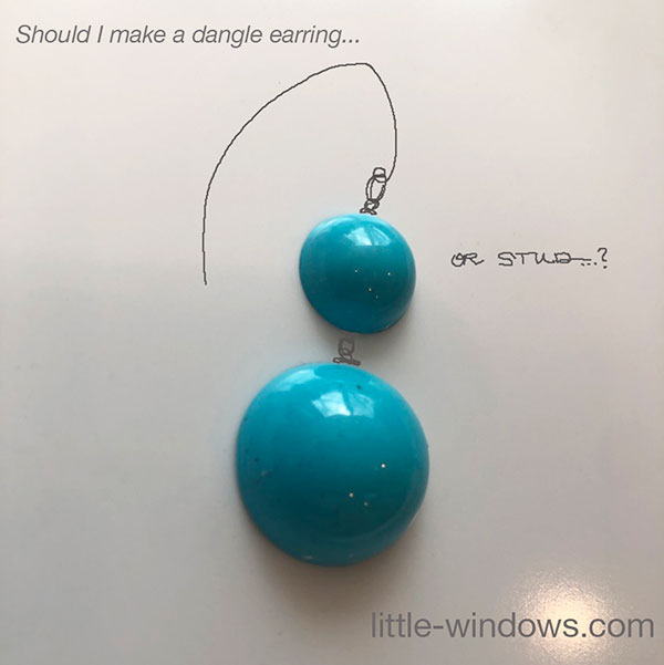 In the end I decided on some simple stud earrings, so I domed up the backs of the smaller pieces with clear resin and embedded the post in it, for the very best possible hold. The larger casting ended up as a cabinet knob!