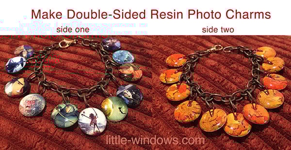 Our Special Photo Paper for Resin is not only waterproof, it's double-sided. Above you can see me doming the front side of these round photo charms. I let that set up, flipped them over and domed the backside, which was printed with a leaf pattern from the movie. Once the resin had thickened up for 1-1/2 - 2 hours I inserted simple red wire loops on the back sides.