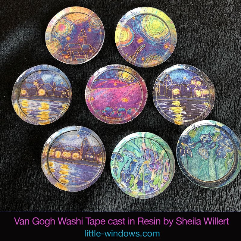 These projects made by Sheila Willert follow the same technique using washi tape mounted on white paper. She punched out shapes and cast them in resin: