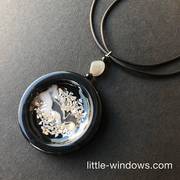 I made some black and white resin using Resin Colorants, let that thicken up for 30 minutes, then drew and shaped designs using Tiny Pointy Swabs. I then added some chunky silver glitter and let that set up. Fed a headpin through the hole in the bezel and added a couple of beads and a pearl, wire wrapped the top of the headpin and fed 2 Natural Black Rubber Chains through.