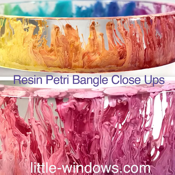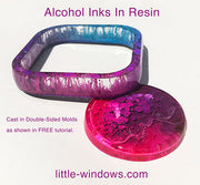 When you do the petri technique in open molds, you're dripping colored inks into resin, then dripping white alcohol ink to push the colors down into your resin. With a thin mold like these bangle molds, you'll need to assist the ink down into the mold by poking it down with our Tiny Point Swabs, paper clips or a headpin. Stabby stabby stab. These pieces were made as part of our Resin Bangle Video Tutorial above. You'll see demolding of the alcohol ink bangle at about 14:20.
