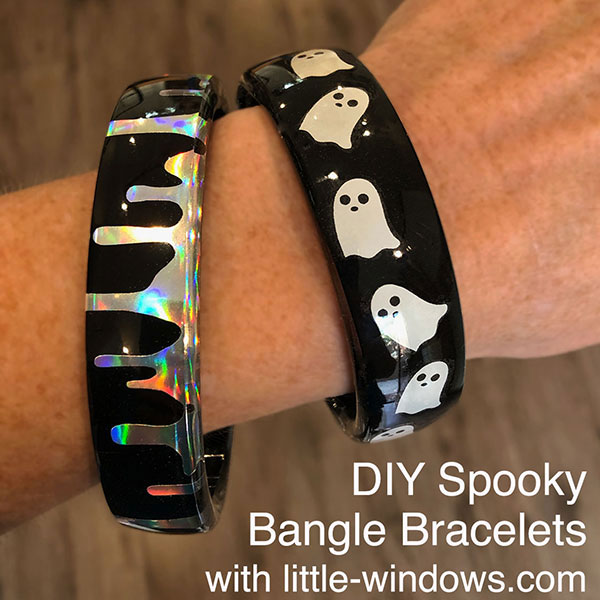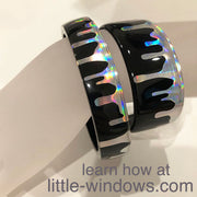 Let's make some resin bracelets - bangle and cuff - with stickers and black paper. Start by cutting strips of paper to fit your molds. Decorate with stickers, rub down firmly.