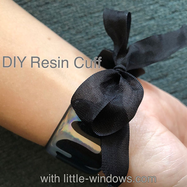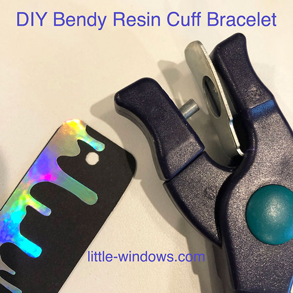 As with all bendy resin projects, timing is important for this technique. You'll need to bend your resin strip while it's still soft enough to shape easily, but firm enough that it doesn't fingerprint. Wrap it around something that approximates the size of your wrist, I used a couple of mixing cups taped together with some paper towel between to keep them straight. Use clear packing tape to hold this in place while the resin fully cures - at least 1 more day.