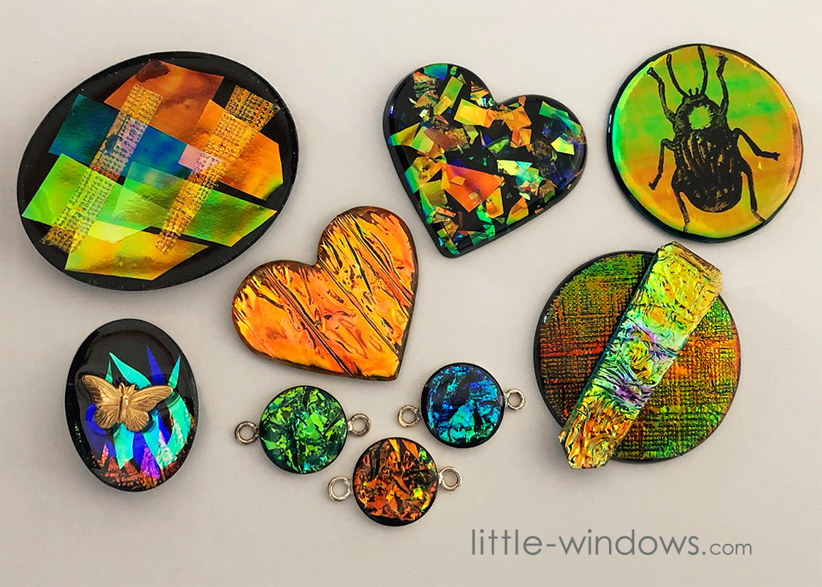 Texture Film has a grid like texture and a rainbow of color that shifts in the light. It's beautiful alone, or put black resin behind it to up the drama.